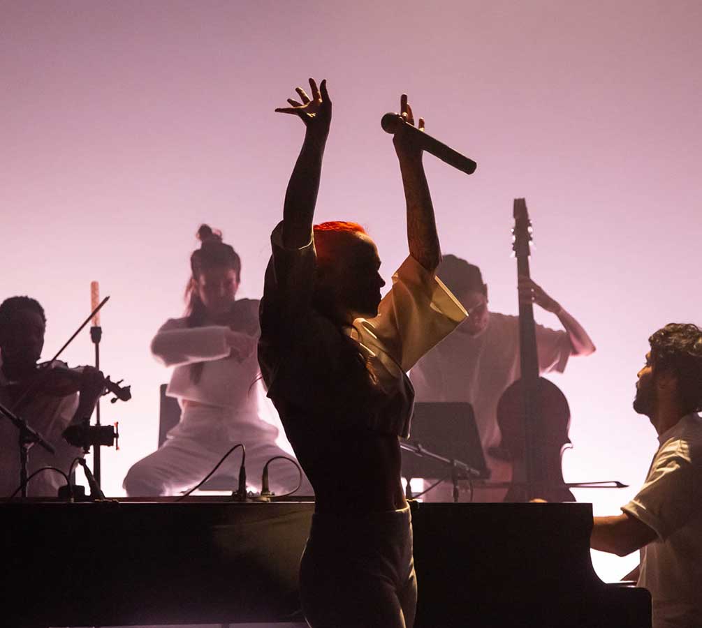Habituellement seule sur scène, son véritable terrain d’action, elle convoque ici l’énergie de tout un orchestre.